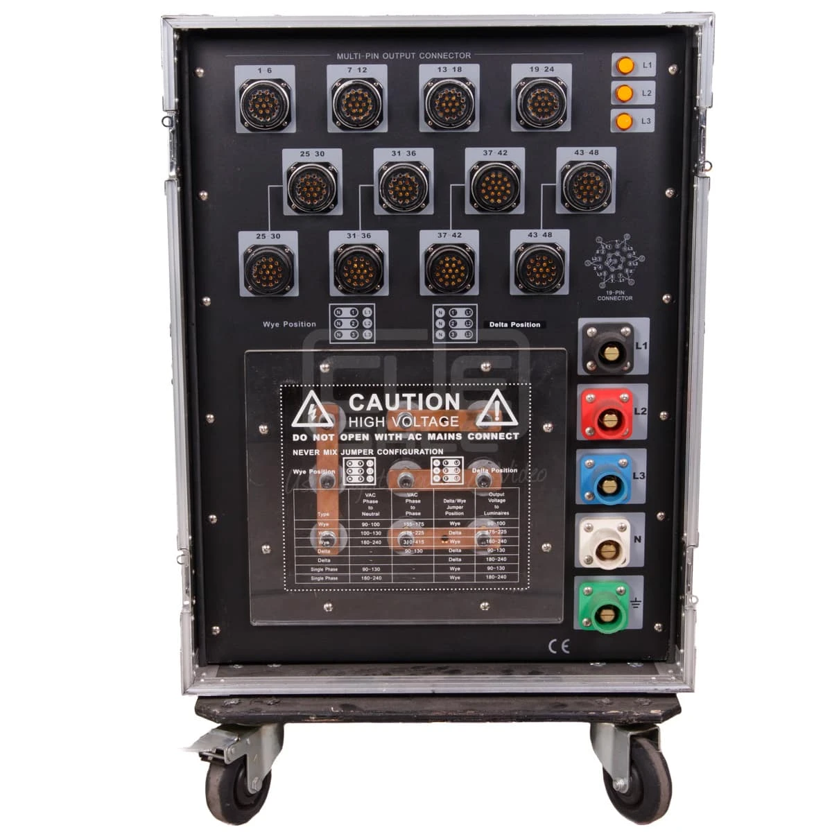 High voltage power distribution rack with socapex outputs and voltage/power meters.