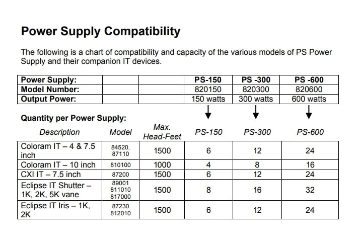 Wybron’s 150-, 300- and 600-watt PS Power Supply units attach easily to a truss or can be mounted into a 19-inch rack. A Power Supply unit can be controlled by one or several DMX512 channels that send DMX signals from the lighting console to each device along with 24 volts DC. Both the signal and the power travel along a single cable, eliminating the need for a separate power cable for each device.